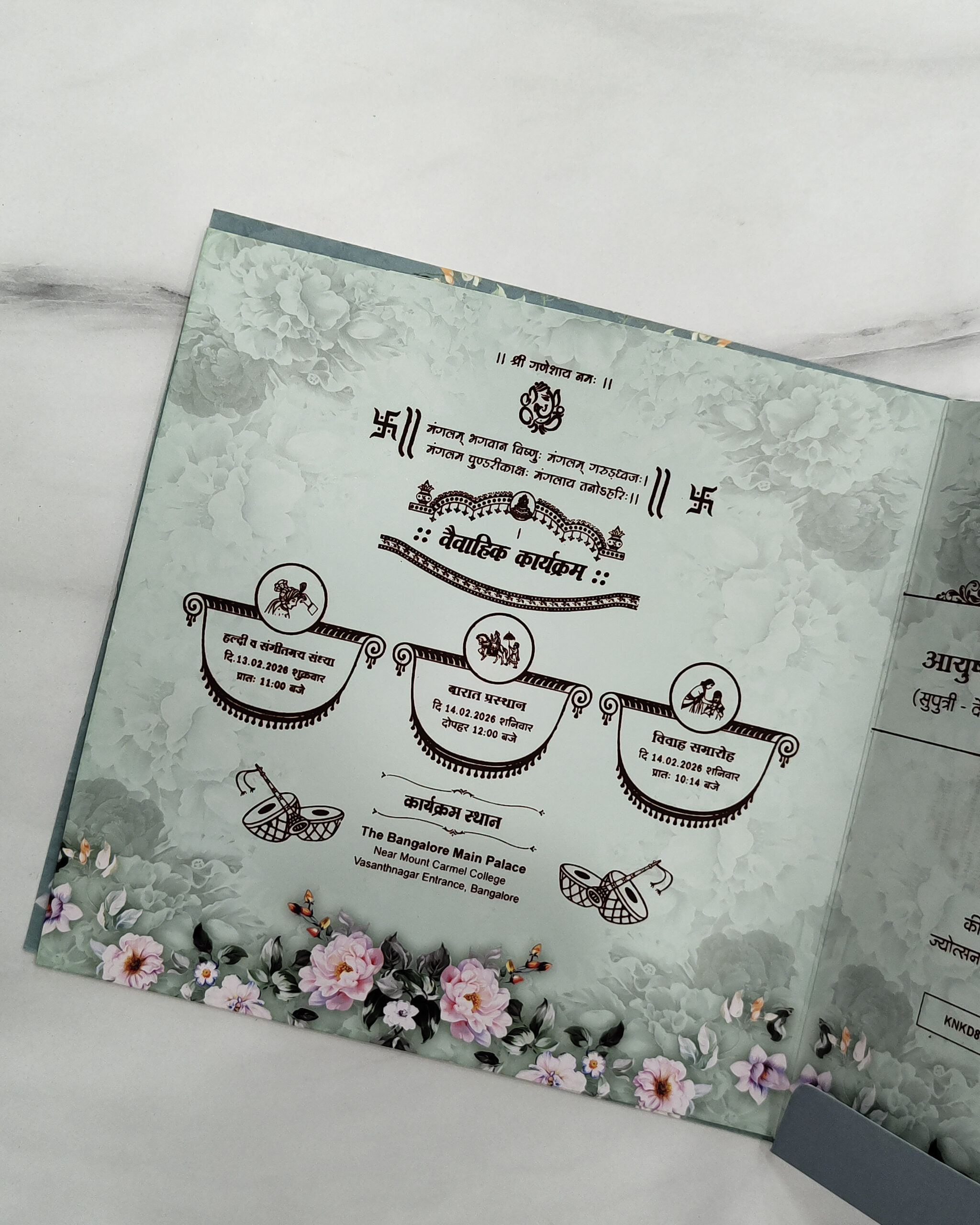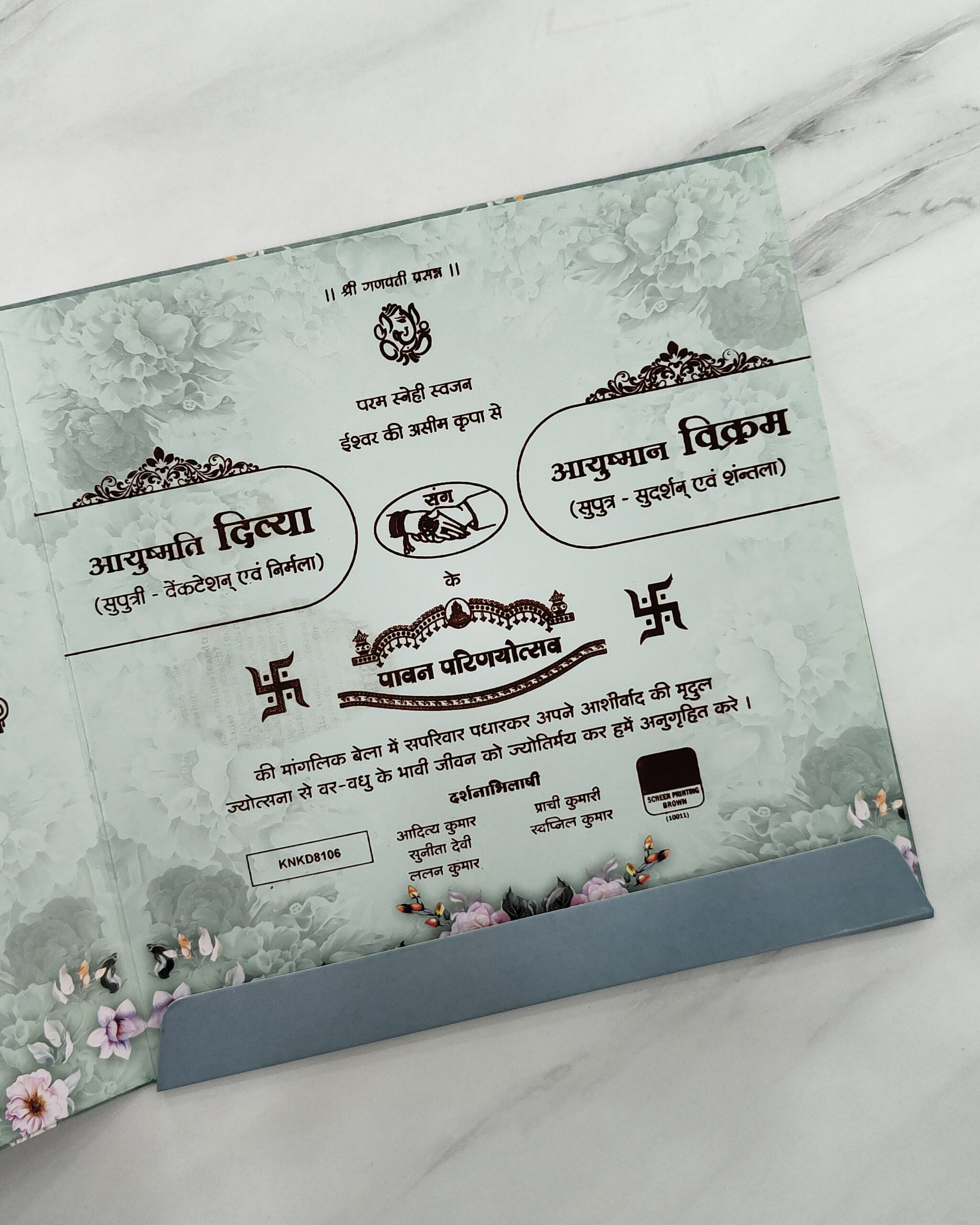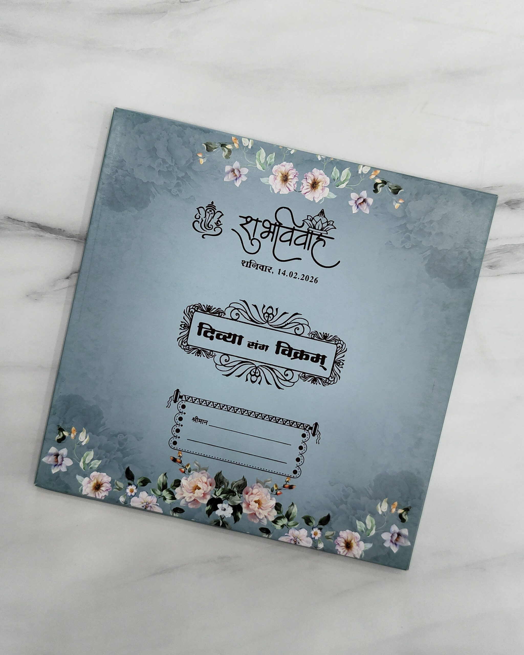 Celebrate your special day with refined elegance through this Aqua Blue Floral Border Square Wedding Card, beautifully framed with delicate floral border detailing. The square design is enhanced with a premium acrylic nameplate and a customisable emblem, adding a personalised and modern touch. Paired with a perfectly matching envelope, this invitation is ideal for couples seeking a fresh, graceful, and luxurious wedding announcement.