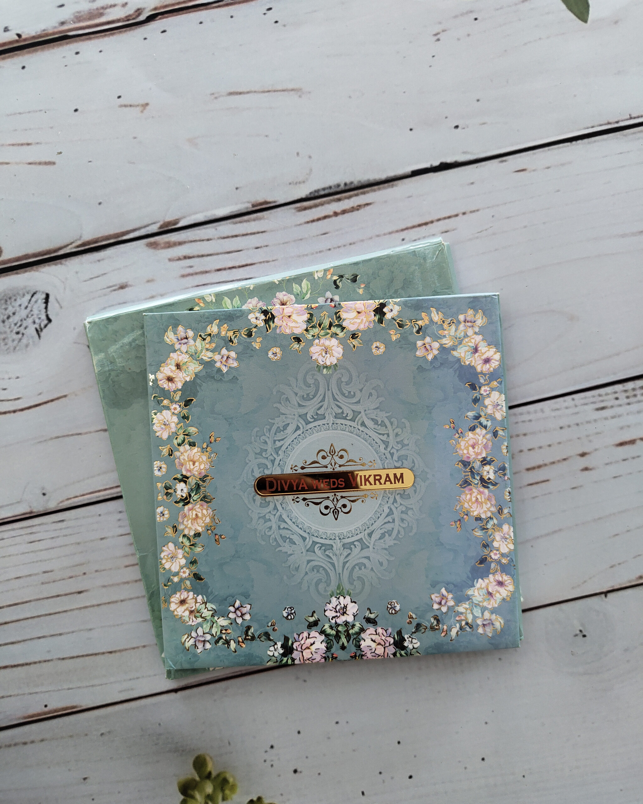 Blue Floral Padded Wedding Invitation Card with Acrylic Nameplate & Matching Envelope