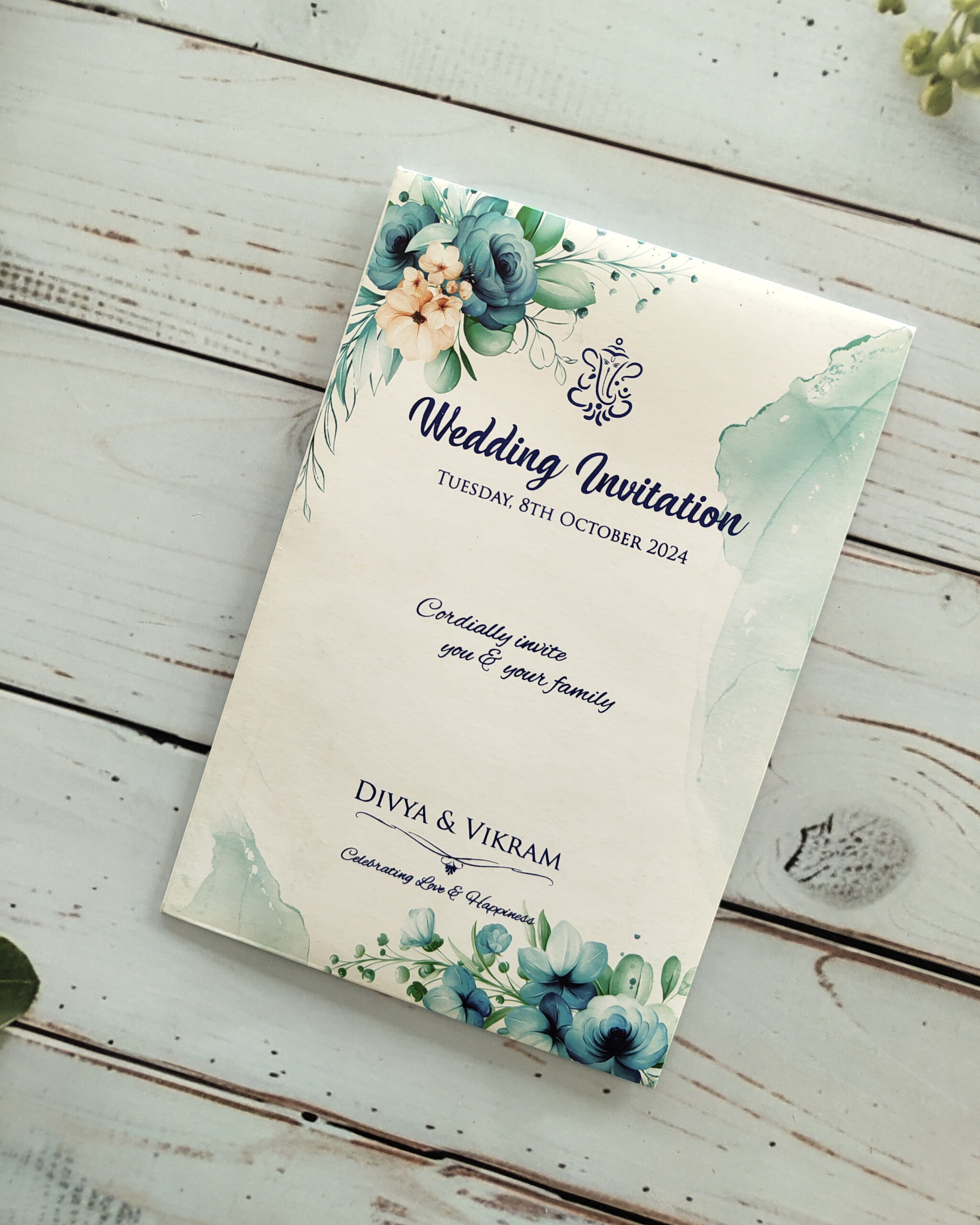 Blue Floral Wedding Card with Matching Envelope
