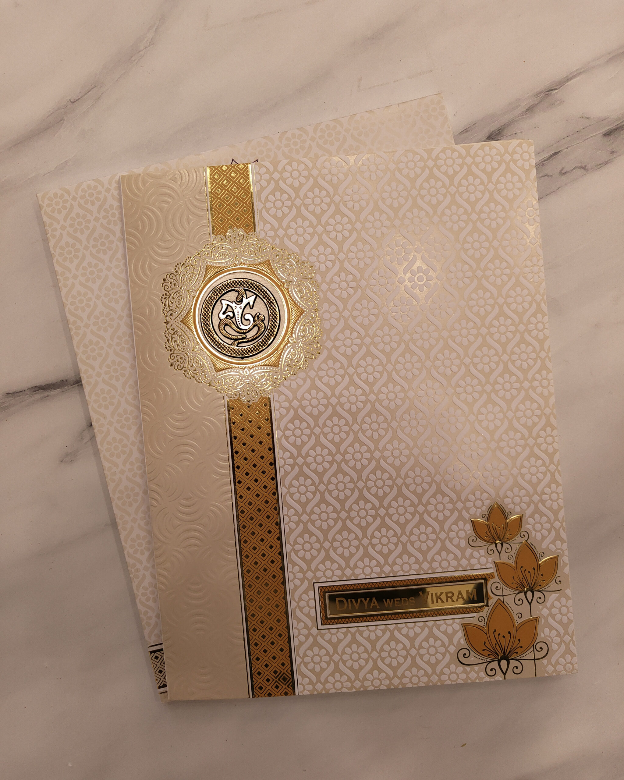 Cream & Gold Embossed Wedding Invitation Card with Acrylic Nameplate & Customisable Emblem | Premium Matching Envelope