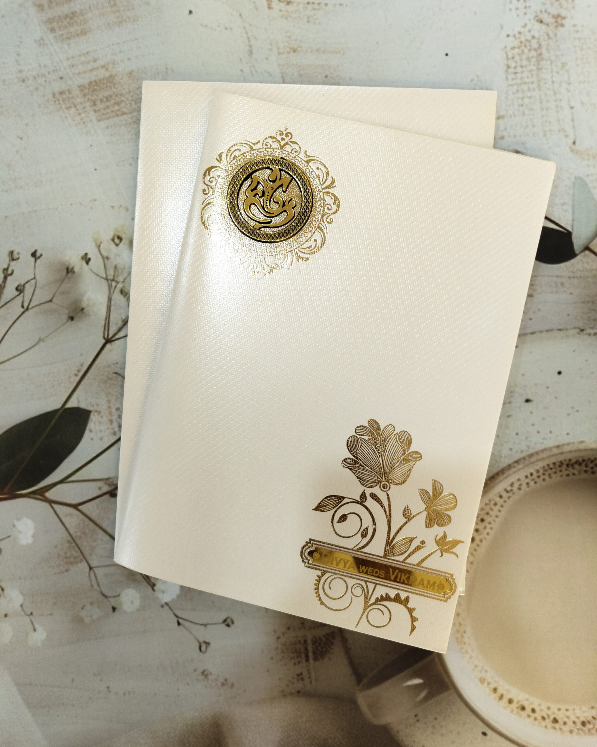 You're viewing: Premium Cream & Gold Ganesha Wedding Invitation Card with Custom Acrylic Nameplate and Matching Envelope 50.00
