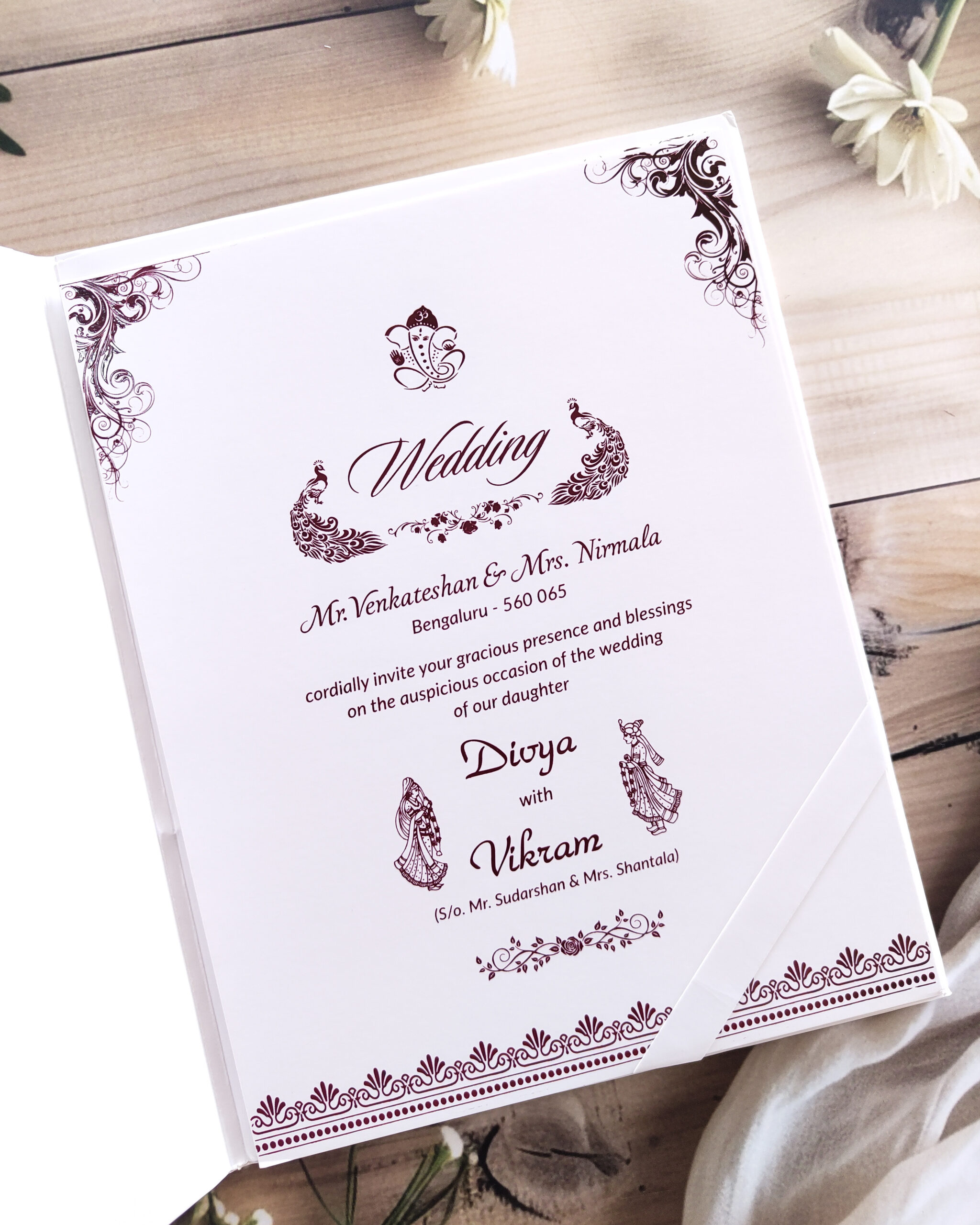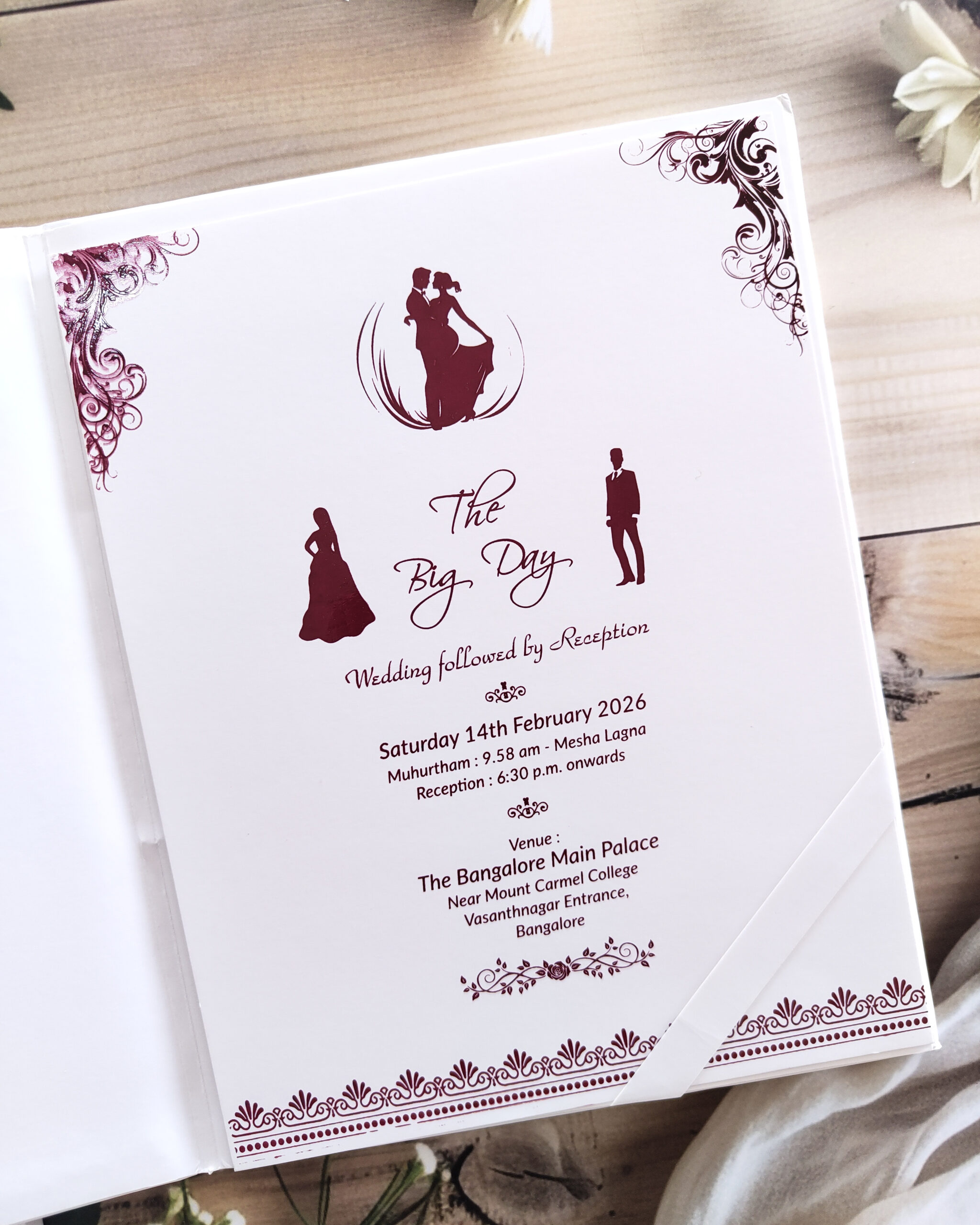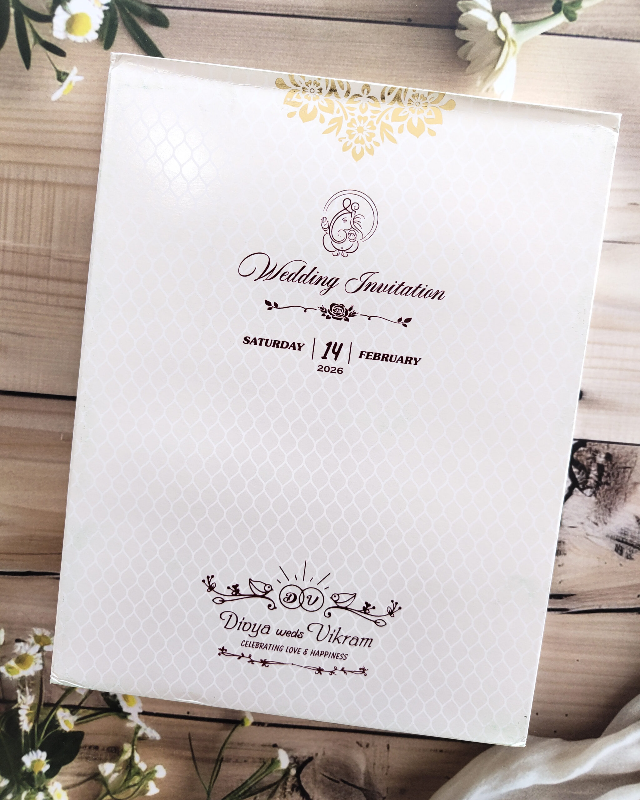 This white luxury padded embossed wedding invitation card showcases timeless elegance with a rich, premium finish. Featuring fine embossing, a sophisticated acrylic nameplate, and a customisable emblem, it offers a beautifully personalised look. Paired with a matching envelope, this invitation is perfect for grand and elegant weddings, crafted to leave a refined and lasting impression on your guests.