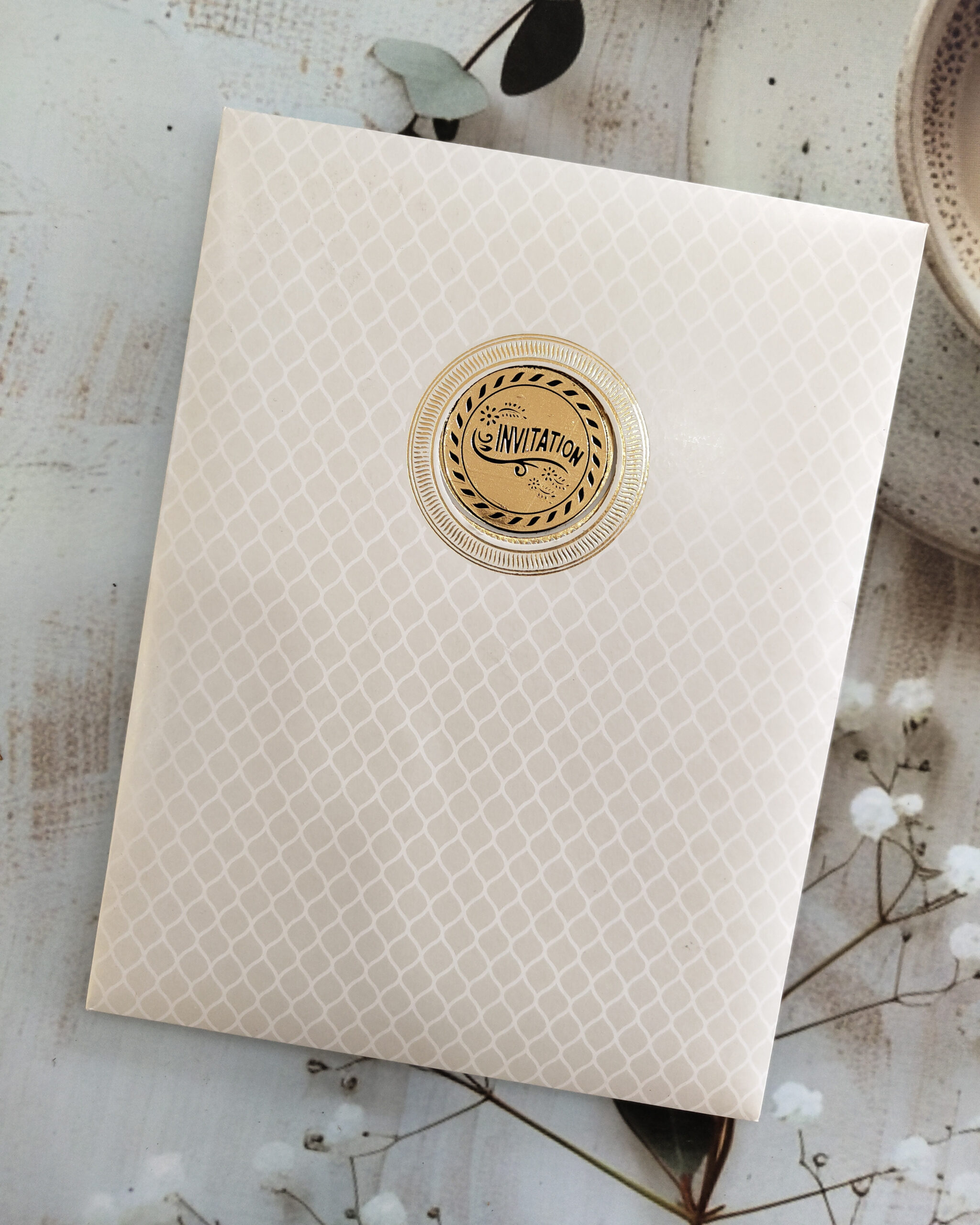 Make your wedding unforgettable with this white wedding card featuring exquisite gold foil detailing, paired with a matching envelope. Perfect for couples seeking a classic, elegant, and luxurious invitation, this premium card brings sophistication and style to your special day.